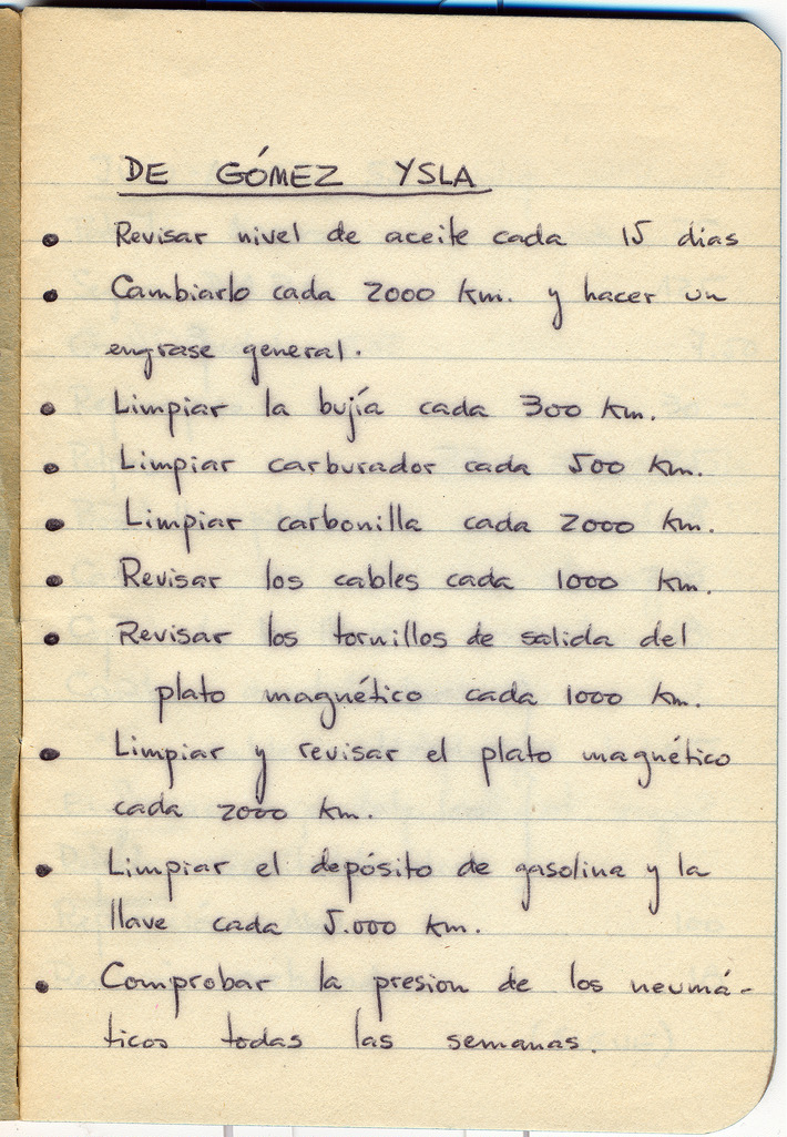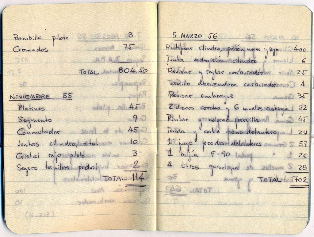 «Ya he comentado antes que mi padre era muy metódico y ordenado, y llevaba un «cuaderno de bitácora» de Pirracas en el que escribía todo lo que le iba haciendo. Ese cuaderno comienza en 1955 y termina en 1963. La primera página es un recordatorio de lo que había que hacerle a Pirracas regularmente según el entonces presidente del Vespa Club de España de entonces, D. Manuel Gómez Ysla (quien tenía una tienda Vespa en la calle Piamonte de Madrid). La segunda página es una muestra de los apuntes de trabajo de Pirracas. Obsérvese que 1 litro de gasolina costaba en 1956 la friolera de 7 pelas.»