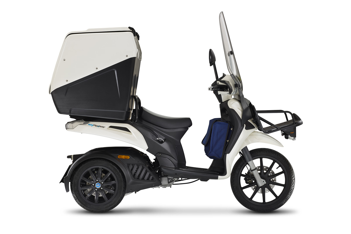 Mymoover es la evolución del delivery urbano. Las 3 ruedas y el baúl trasero inclinable hacen que el vehículo sea estable y maniobrable, facilitando las operaciones de parada y arranque sin caballete por conducción fácil, intuitiva y segura. La capacidad de carga, distribuida en 3 soportes supera del 80% a un vehículo de dos ruedas equivalente. La caja negra y el lector de tarjeta hacen que el Mymoover esté siempre conectado y sea rastreable.