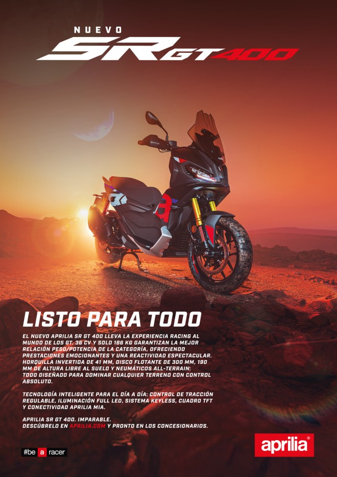 El nuevo aprilia sr gt 400 lleva la experiencia racing al mundo de los GT. 36 cv y solo 186 kg garantizan la mejor relación peso/potencia de la categoría, ofreciendo prestaciones emocionantes y una reactividad espectacular.