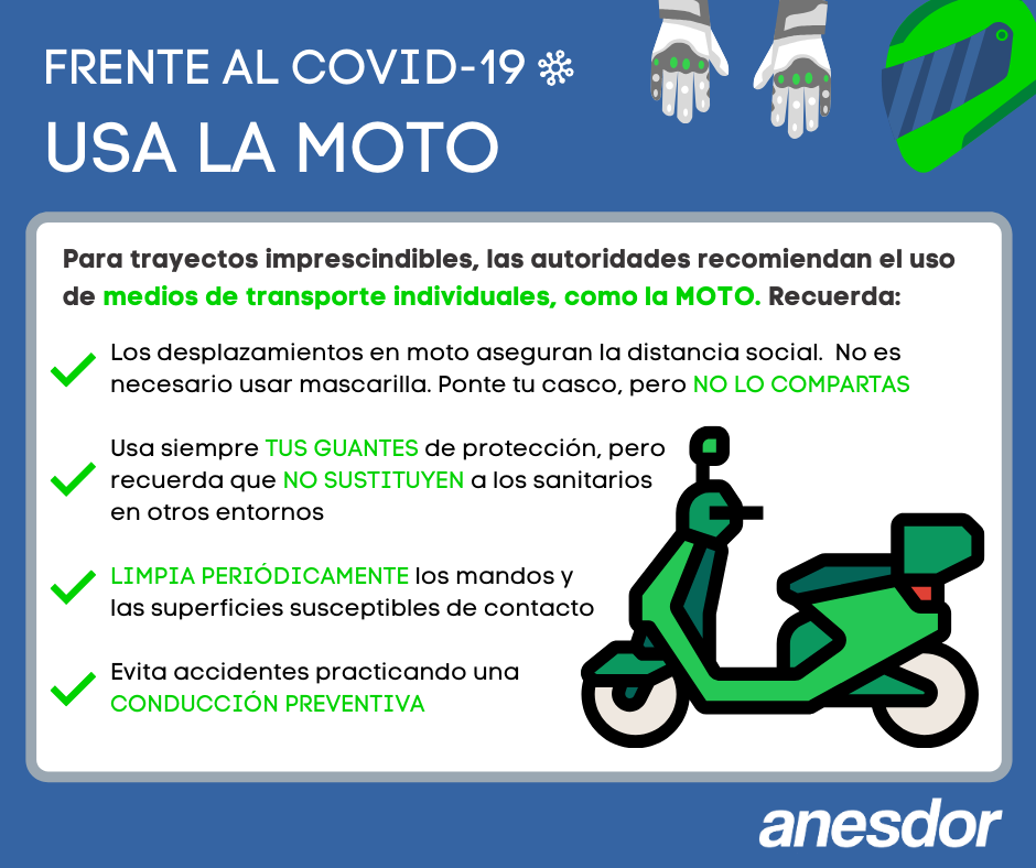 Con la progresiva desescalada del confinamiento, desde la Asociación ANESDOR ven oportuno comenzar ya a promover el uso de la moto como una solución de transporte eficiente en el marco del Coronavirus y nos presentan estos consejos. Los Ministerios de Sanidad y Transporte recomiendan el uso de medios de transporte individuales y en este contexto la moto se presenta como una alternativa social.