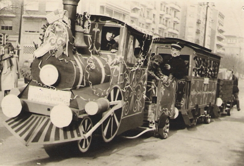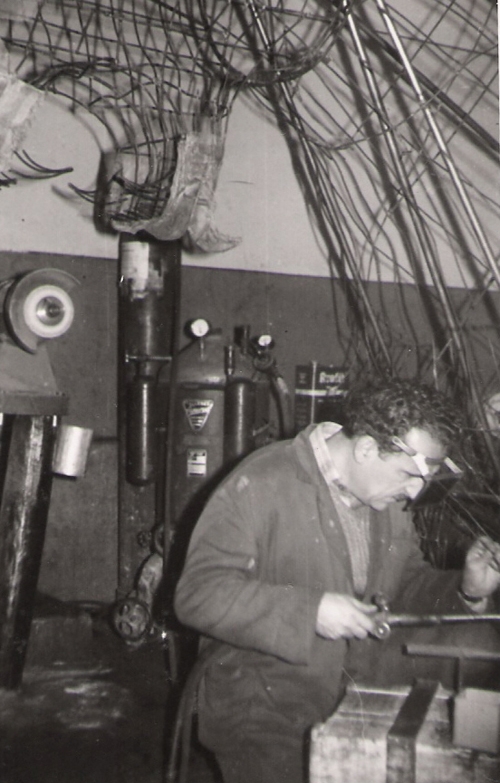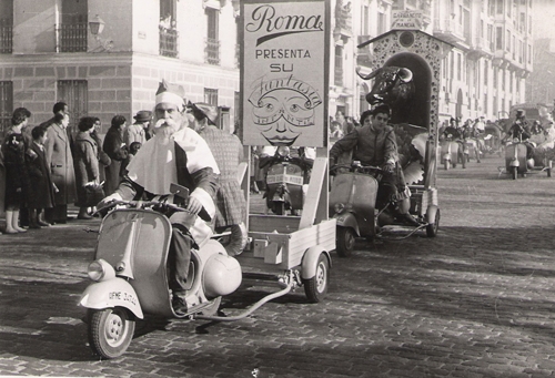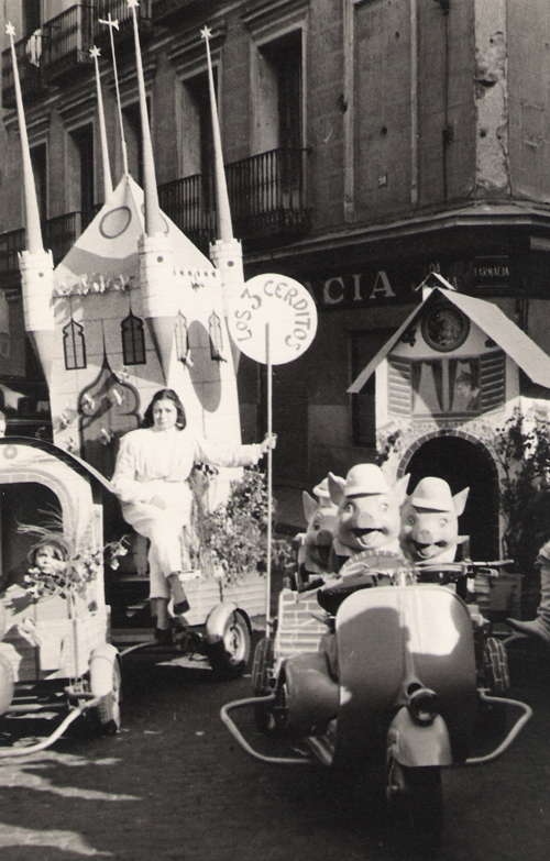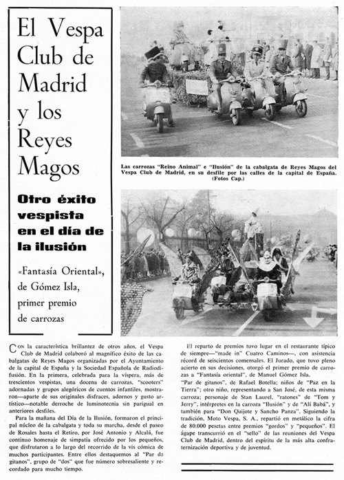 A finales de los años 50, Vespa Roma tuvo un muy importante papel en las Cabalgatas de Reyes de Madrid, ya que presentaba carrozas muy elaboradas y en algunas ocasiones de grandes dimensiones, que llamaban la atención al ser tiradas por Vespas o Vespacares. Requerían mucho trabajo y mucho tiempo, pero como se puede ver en esta foto Manuel Gómez Ysla lo hacía personalmente y con muchísima ilusión. En esta ocasión preparaba el armazón del dragón que presentaron en el año 1965 en la carroza “San Jorge y el dragón”