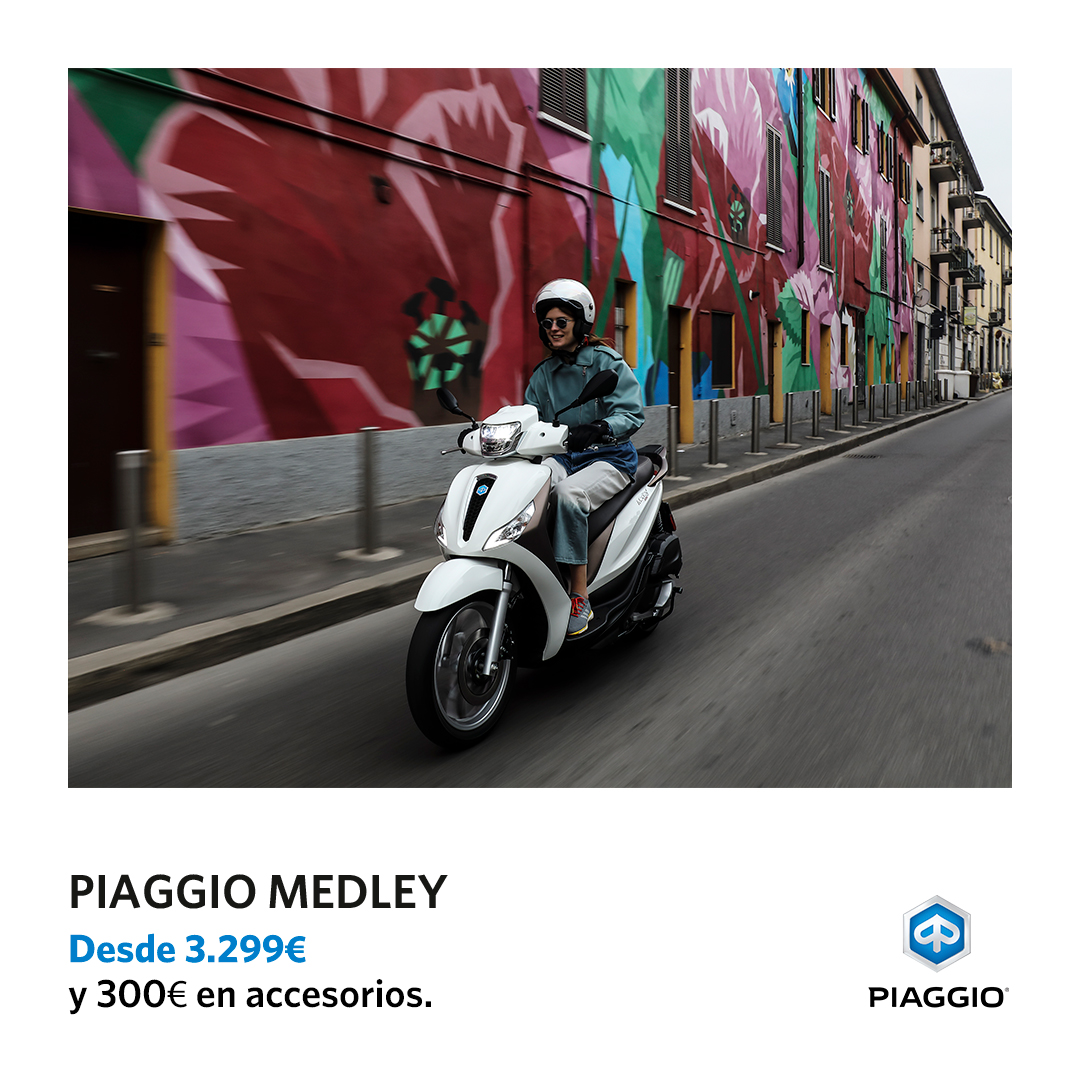 Consigue más espacio para tu tiempo. Conduce la nueva Piaggio Medley ahora con 15 CV de potencia desde 3.299€ con hasta 300€ en equipamiento gratuito.