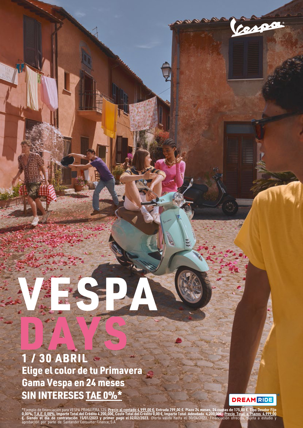 * Ejemplo de financiación para VESPA PRIMAVERA 125. Precio al contado 4.999,00 €. Entrada 799,00 €. Plazo 24 meses, 24 cuotas de 175,00 €. Tipo Deudor Fijo 0,00%, T.A.E. 0,00%. Importe Total del Crédito 4.200,00€, Coste Total del Crédito 0,00 €, Importe Total Adeudado 4.200,00€, Precio Total a Plazos 4.999,00 €. Siendo el día de contratación 15/01/2023 y primer pago el 02/02/2023. Oferta válida hasta el 30/04/2023. Financiación ofrecida, sujeta a estudio y aprobación por parte de Santander Consumer Finance, S.A