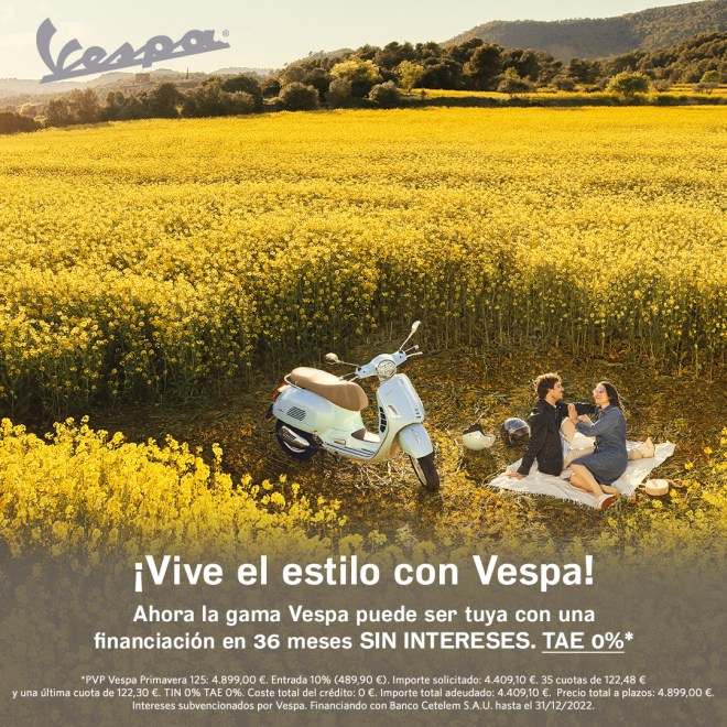 *Ejemplo de financiación para VESPA PRIMAVERA 125 con un PVP: 4.899,00 €. Entrada 10% (489,90 €). Importe solicitado: 4.409,10 €. 35 cuotas de 122,48 € y una última cuota de 122,30 €. TIN 0% TAE 0%. Total intereses: 0 €. Coste total del crédito: 0 €. Importe total adeudado: 4.409,10 €. €. Precio total a plazos: 4.899,00 €. Intereses subvencionados por Vespa. Financiando con Banco Cetelem S.A.U.